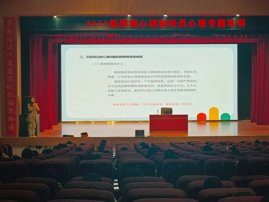 为进一步提高2022级班级心理委员、宿舍心理信息员的心理健康素养和专业技能,2022年10月18日晚,学工部心理健康教育中心在仓山校区大礼堂举办了2022级朋辈心理辅导员心理专题培训活动。本次培训活动由心理健康教育中心主任罗香群、专职心理教师李娟两位老师主讲,仓山校区共234名朋辈心理辅导员参加本次培训活动。