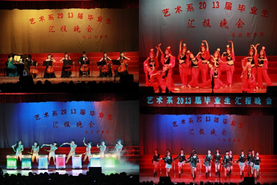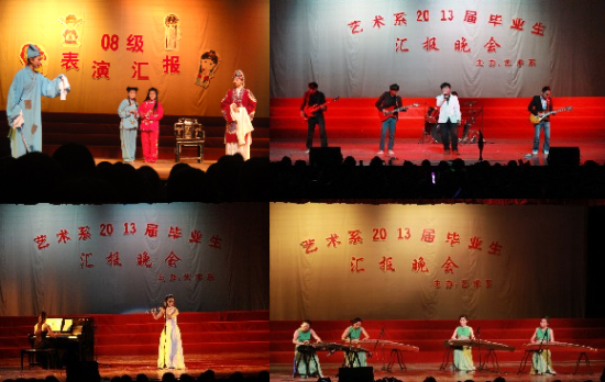2012年12月至2013年1月,艺术系举办了2013届声乐、钢琴、舞台表演主修生专场汇报音乐会,乐队,钢琴与小提琴独奏,钢琴独奏,综合毕业汇报等9场专场演出。此次系列汇报音乐会由艺术系各教研室和2013届各专业承办,莅临各场汇报演出的领导老师有陈华校长、学校各处室领导以及艺术系领导、师生们。