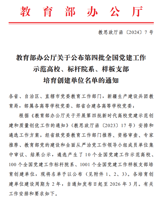 近日,教育部办公厅公布了《第四批全国党建工作示范高校、标杆院系、样板支部培育创建单位名单的通知》,艺术教育学院教工第一党支部光荣入选第四批“全国党建工作样板支部”培育创建单位 。