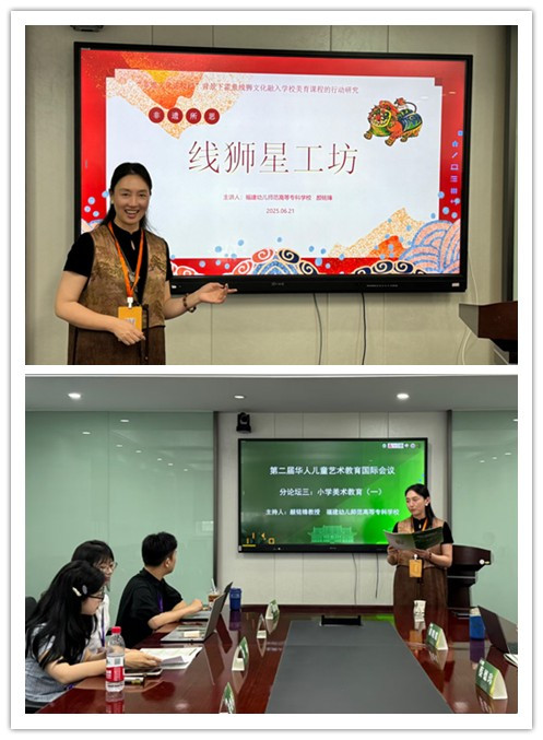福建幼儿师范高等专科学校艺术教育学院颜铭锋教授参加了此次会议,委派作分论坛学术主持,并作《线狮星工坊的实践探索》主题分享,聚焦非遗融入儿童美育实践。她通过丰富案例,展示非遗元素融入儿童美育课程与教学活动的创新路径,从课程设计、教学实施到学生能力培养,系统剖析非遗文化融入高职院校艺术教育的模式,强调非遗主题艺术工坊能让学生沉浸式感受传统文化魅力,增强传承使命感,也为职业艺术教育注入文化内涵。