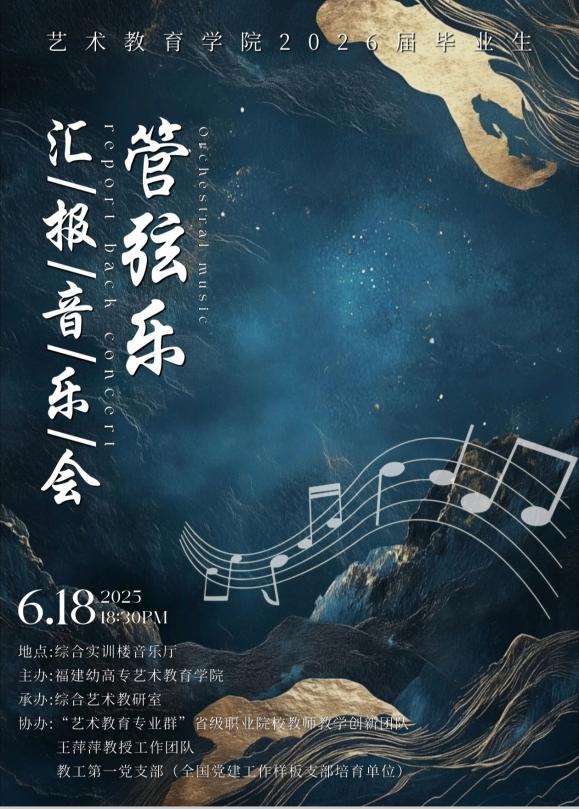 2025年6月18日晚上,艺术教育学院“2026届毕业生管弦乐专场”汇报音乐会在综合楼音乐厅奏响,这场演出不仅是2026届毕业生多年学习成果的集中展示,也是“艺术教育专业群”省级职业院校教师教学创新团队、王萍萍教授工作团队教学成效的生动体现。莅临本场音乐会的有艺术教育学院党总支姜琪书记、院长王萍萍教授、综合艺术教研室主任陈纯灵老师、学院学生工作负责人林烜老师以及综合艺术教研室各位老师们。