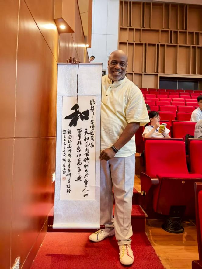 在演出交流活动中,艺术教育学院青年古筝教师申毅的《海之波澜》气势磅礴、余韵悠长,尽显中华文化的深厚底蕴。由陈语老师指挥、卢雨茜同学钢琴伴奏,小榕树合唱团演唱了作品《蒹葭》《let us sing》,从古老的诗词歌赋到当代青年的活力飞扬,唱出了我们对美好生活的向往与对和平世界的憧憬。在三坊七巷,小榕树合唱团与美国风声合唱团共同开展快闪活动,齐唱《how deep is your love》,以歌会友,在和谐的音符中寻找共鸣,唱响和平与爱的旋律。为了表达我校对美国朋友们的欢迎与祝福,艺术教育学院向美国风声合唱团、济南外国语学校合唱团赠送了林宏老师的书法作品《和》与《大美无言》,以独具中国特色的礼物,跨越文化的差异,传递和平共处、各美其美的理念。
