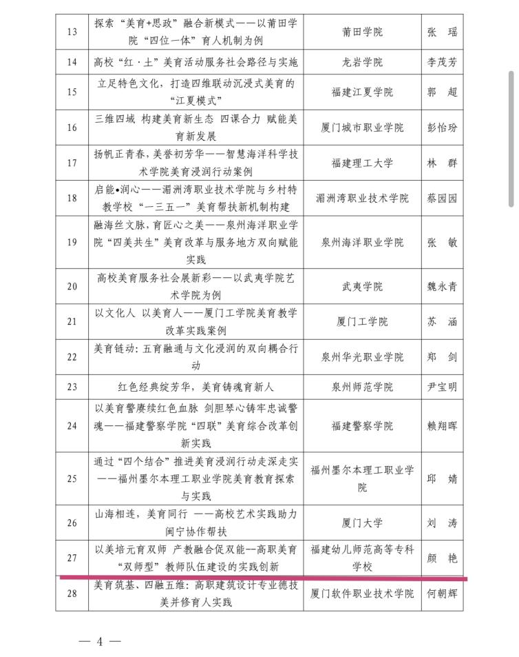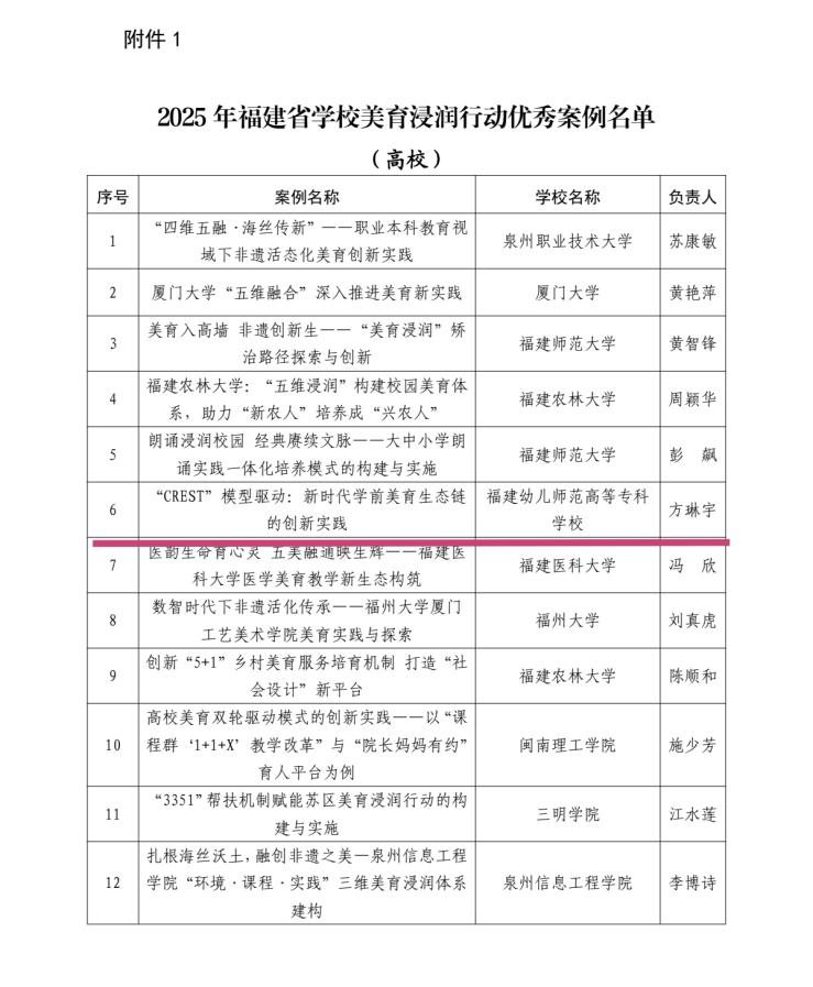 8月19日,福建省教育厅发布《关于公布2025年福建省学校美育浸润行动优秀案例的通知》,在2025年福建省学校美育浸润行动优秀案例遴选活动中,共收到各地各校报送案例271个,经专家评审、网上公示,共评选出优秀案例101项,其中高校案例43项。我校学前教育学院方琳宇老师为负责人的《“crest”模型驱动:新时代学前美育生态链的创新实践》、艺术教育学院颜艳老师为负责人的《以美培元育双师产教融合促双能--高职美育“双师型”教师队伍建设的实践创新》与本科院校同台竞技,入选2025年福建省学校美育浸润行动优秀案例。两个学院分别聚焦“学前教育专业人才培养”与“教师队伍建设”,成为高校优秀案例此类选题的唯一入选项目。