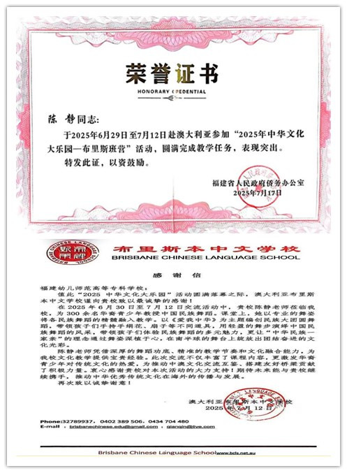 陈静老师的出色表现,得到了福建省人民政府侨务办公室、中共福建省委统战部、澳大利亚布里斯本中文学校的高度肯定和赞誉。福建幼儿师范高等专科学校相关负责人表示,她也是学校长期坚持立德树人、重视中华优秀传统文化教育与艺术专业人才培养成果的缩影。陈静老师在布里斯本营中克服教学挑战、创新教学方法,有效激发了华裔青少年对中华传统文化的热爱与认同,成功实现文化传递的经历,为海外华文教育提供了宝贵经验。她的跨文化实践,生动践行了学院教工第一党支部艺心向党、一融双优的核心理念,彰显党员教师以艺创新淬炼党、坚守初心使命的担当,让华裔少年在美的共鸣里厚植家国情怀,向世界讲好中国故事。