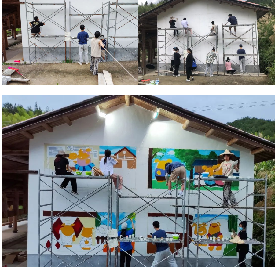 创作过程中,实践队成员们克服困难,自己搭架作画,在昨天布局的基础上,拿起画笔起形、勾画主体、填色。他们认真勾勒每一处细节,空中不时飘起小雨,大家的面庞和衣襟上混杂着汗水、雨水和颜料。从白天到黑夜,看着墙面的内容越来越丰富,设想中的内容慢慢变为现实,尽管过程辛苦,但逐渐浮于墙面的成果让大家甘之如饴。