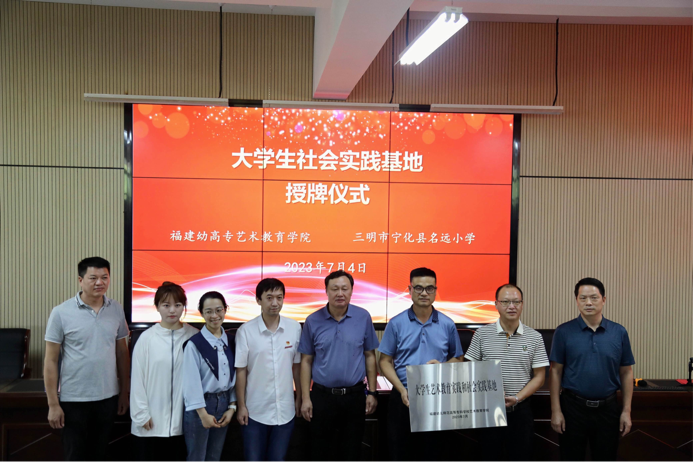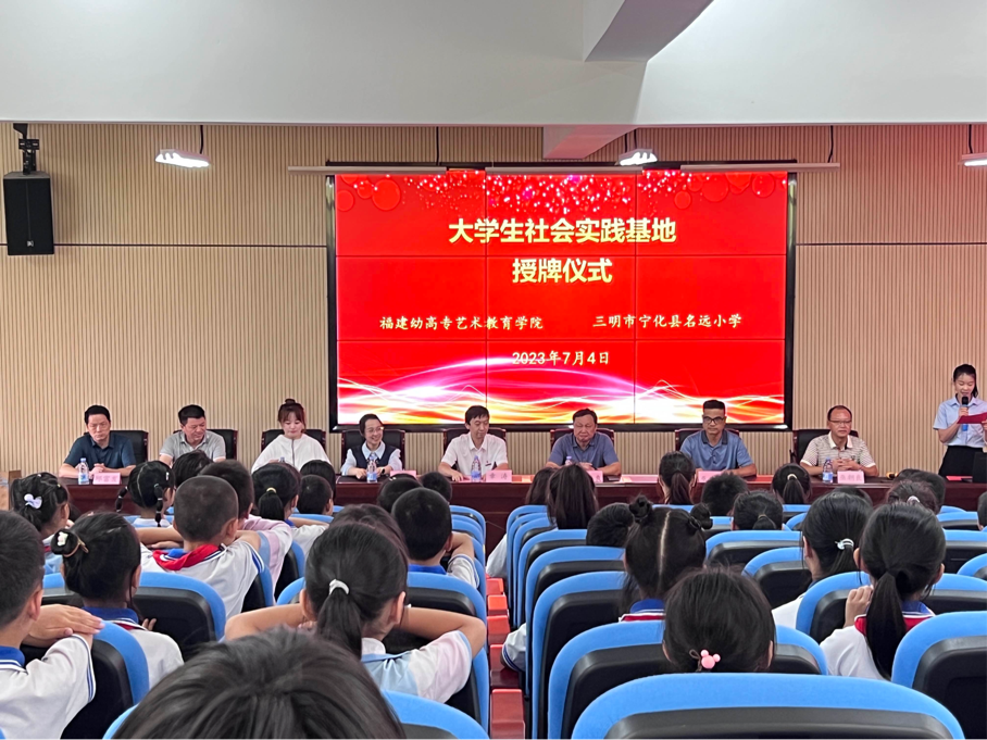 2023年7月4日下午,福建幼儿师范高等专科学校艺术教育学院、三明市宁化县名远小学"艺术教育实践与社会实践基地"授牌仪式暨"艺海拾贝"社会实践开班仪式在三明市宁化县名远小学报告厅举行。宁化县教育局党组成员、党委副书记王进良、福建幼儿师范高等专科学校艺术教育学院学生管理科科长章涛、宁化县名远小学校长巫升根、副校长巫朝良、党支部副书记王盛志、工会主席邱富发、福建幼儿师范高等专科学校艺术教育学院团总支书记傅缘阳、实践队带队教师陈佩伶出席本次授牌仪式暨社会实践开班仪式。同时参加本次开班仪式的还有宁化县名远小学暑期夏令营的学生以及学院"艺海拾贝"社会实践队全体成员。