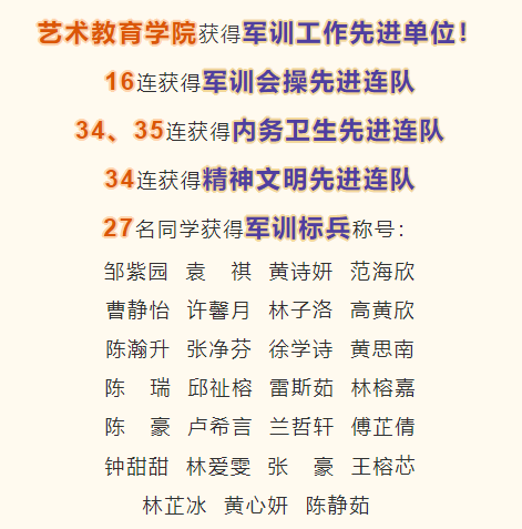 艺术教育学院2024级参训新生共分为15、16、17、33、34、35六个连队,学生辅导员为谢丽琴、陈佩伶两位老师。艺术教育学院学子们以最佳状态迎接军训成果检验,并取得优异成绩!