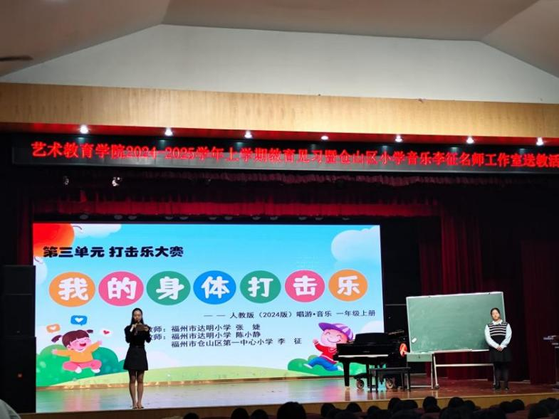 活动还邀请仓山区小学音乐李征名师工作室、台江区中小学美术郑冰心名师工作室团队的一线名师为学生进行艺术课片段教学示范。名师工作室领衔名师和团队成员为学生进行现场片段教学点评,并就新艺术课程标准下艺术教师素养、教学技能、教育方法以及教学资源运用等方面与专任教师、学生展开了现场探讨与交流。活动中,高校教师、一线专家以及名师联动相融,共同为学生的成长保驾护航。