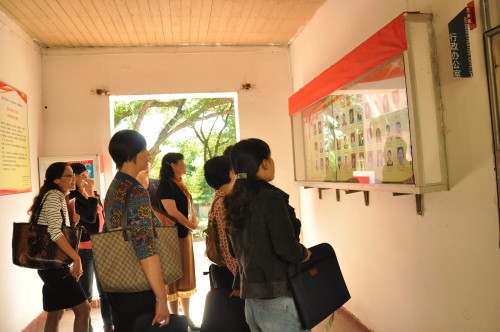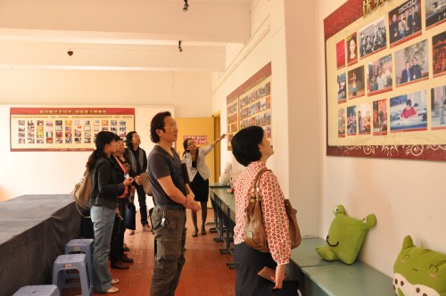考评组观看活动室女教职工活动展板