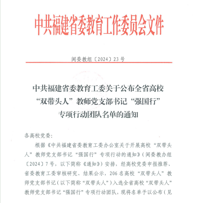 近日,中共福建省委教育工委关于公布全省高校“双带头人”教师党支部书记“强国行”专项行动团队名单,我院教工第一党支部书记颜艳团队成功入选!